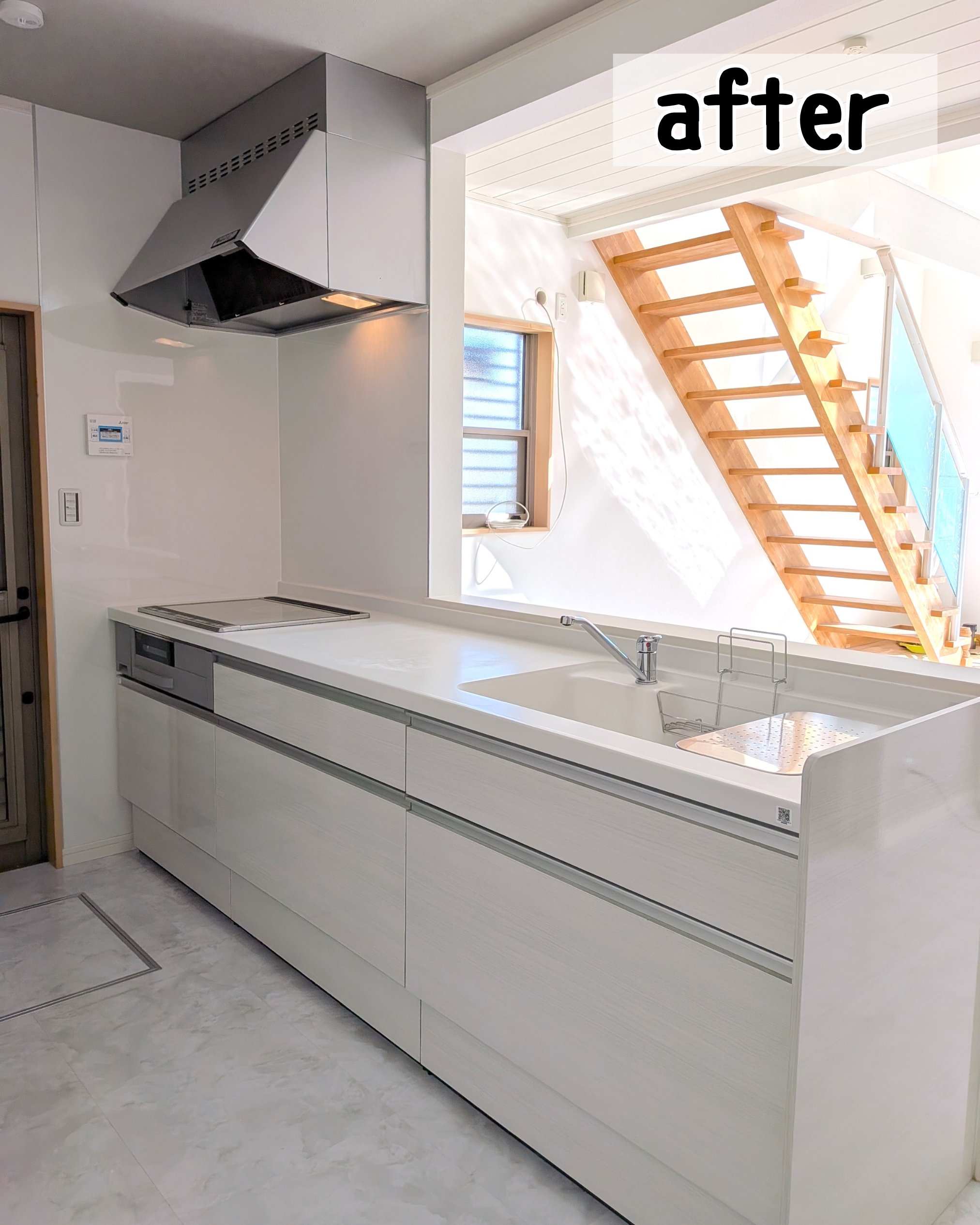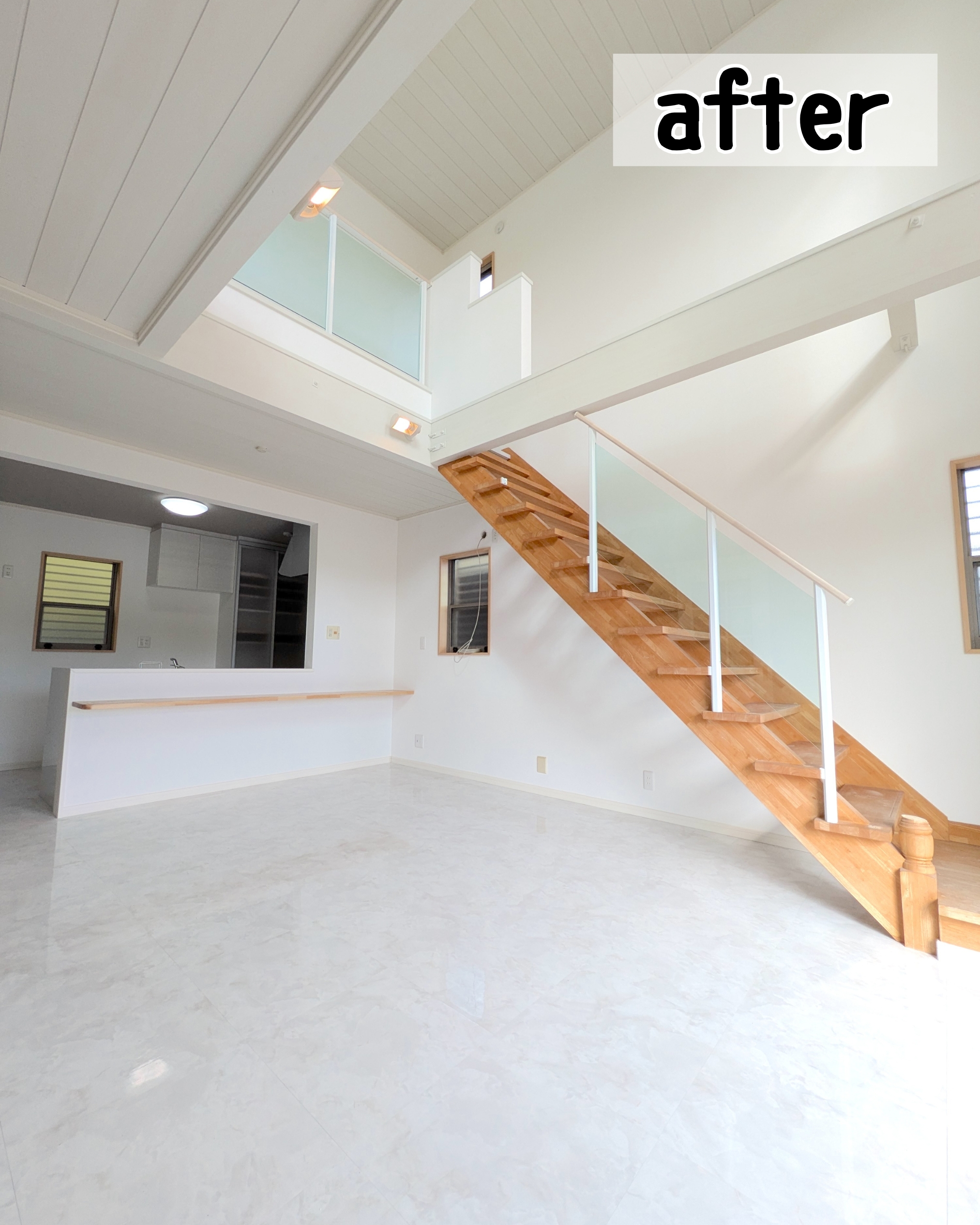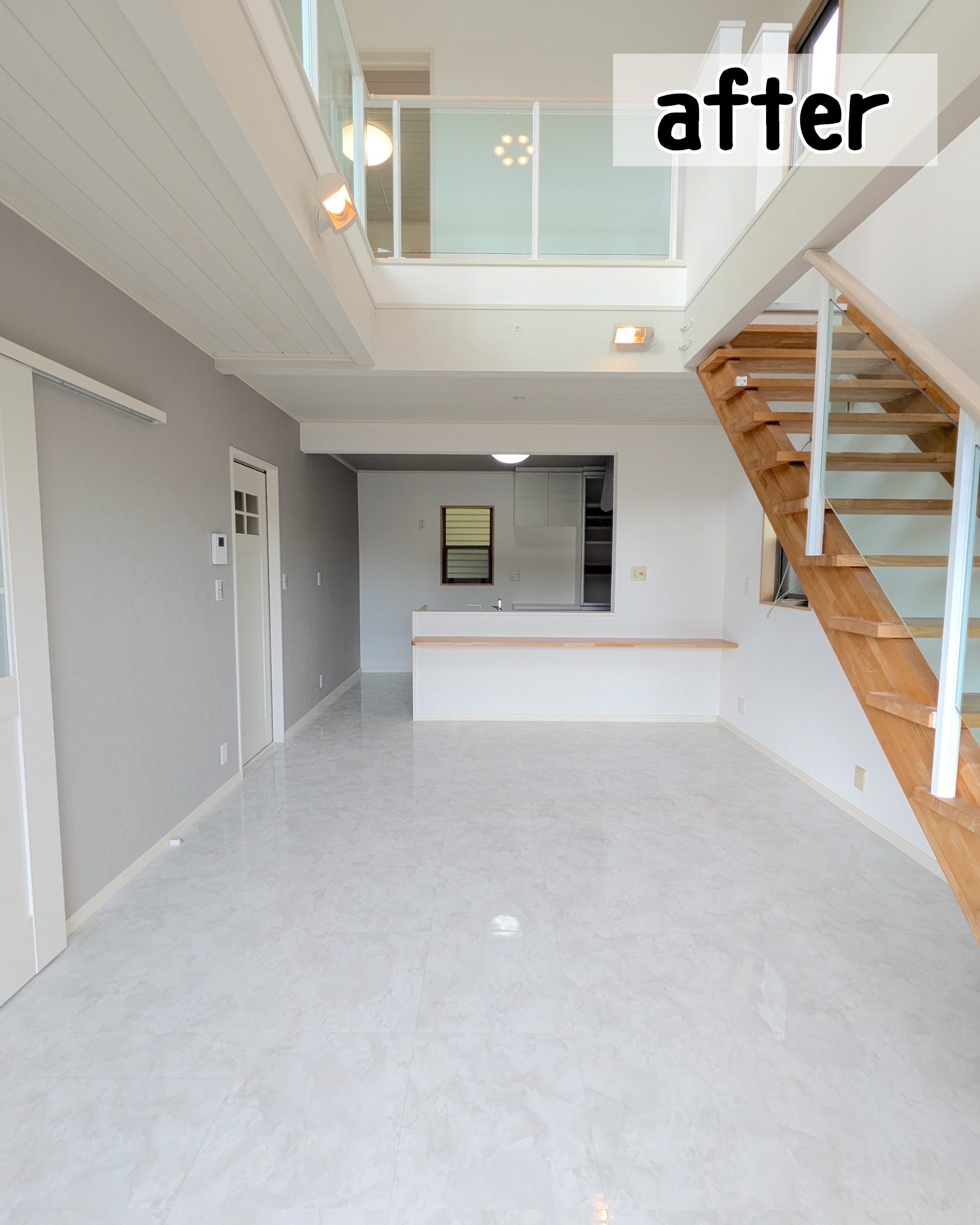 こだわりポイントは、吹き抜けのあるリビングと白いかべ。お気に入りポイントは、白を基調とした抜け感のあるキッチンからの眺め(笑)