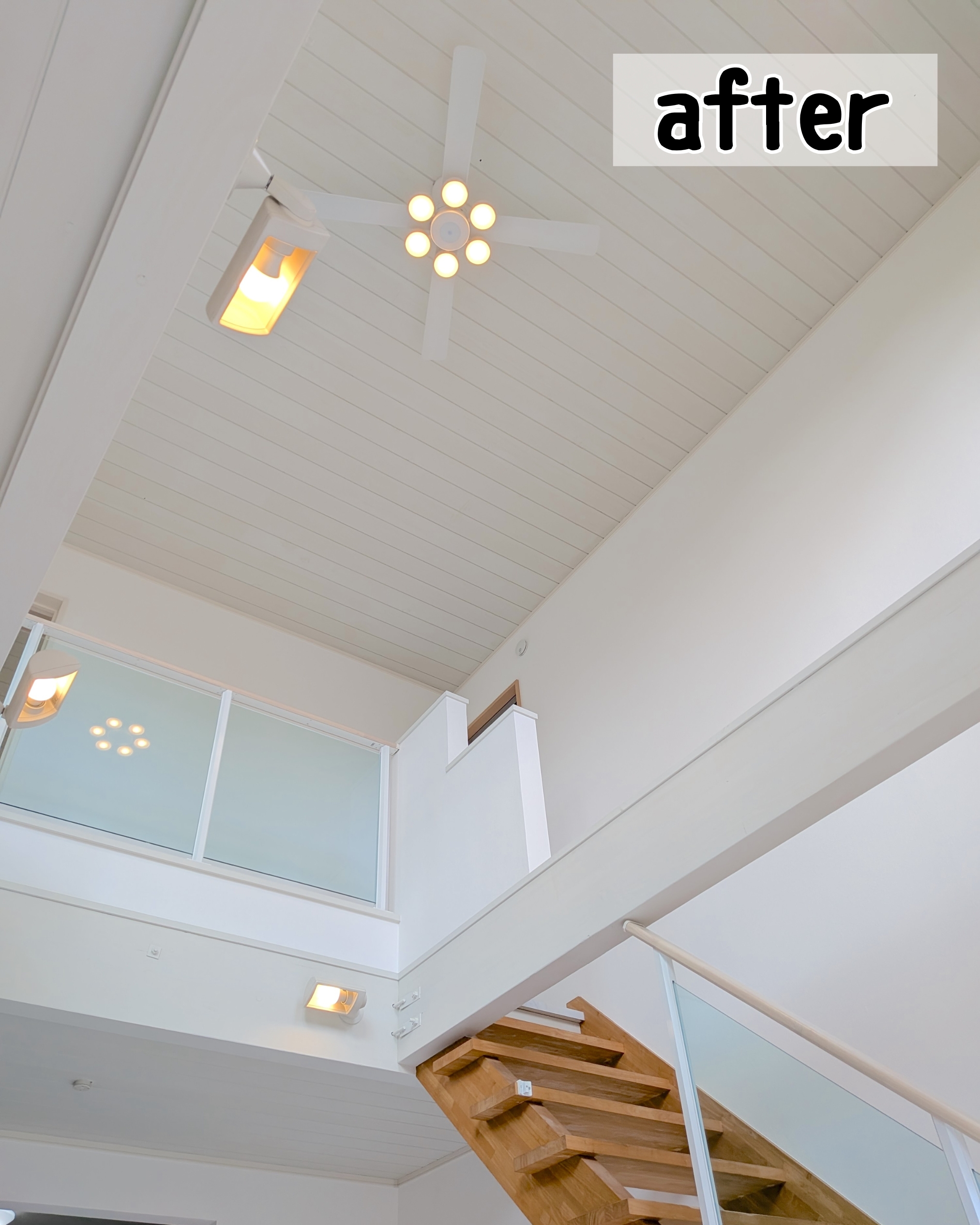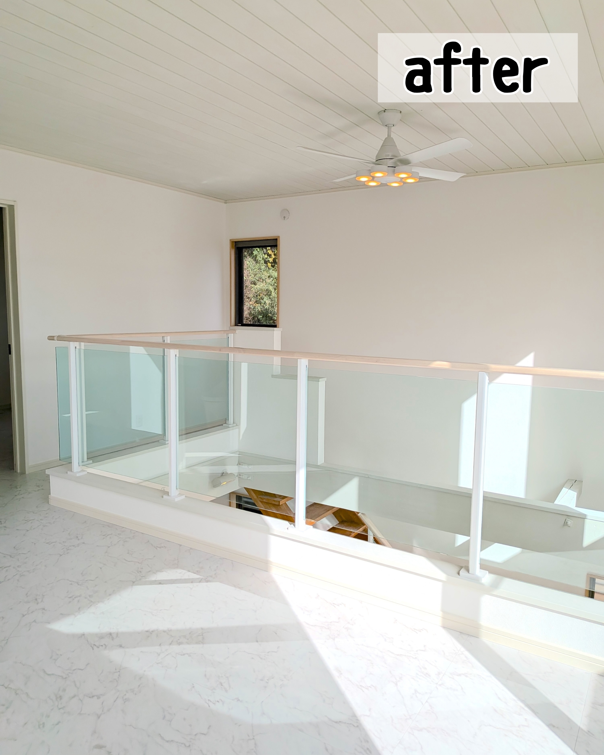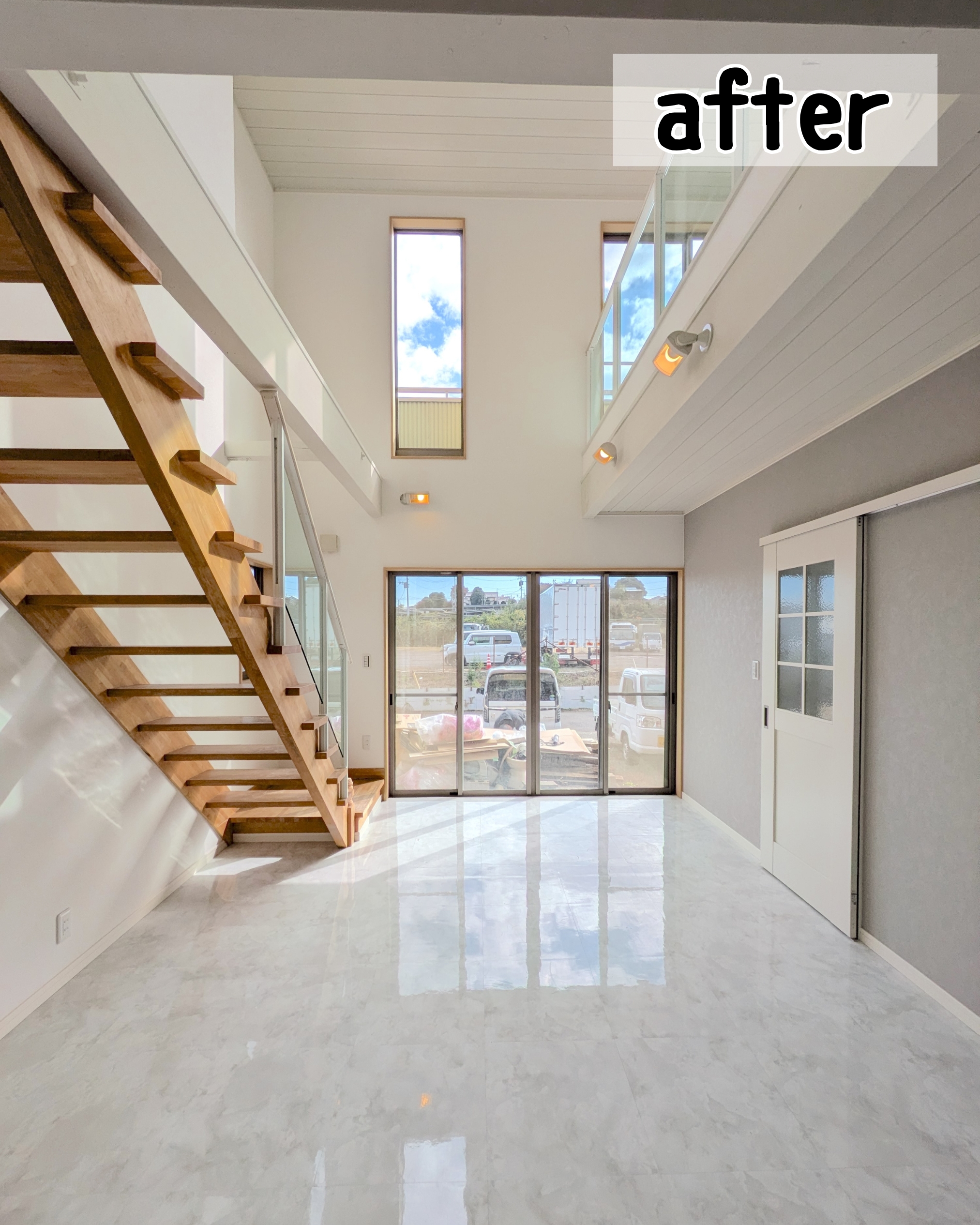 こだわりポイントは、吹き抜けのあるリビングと白いかべ。お気に入りポイントは、白を基調とした抜け感のあるキッチンからの眺め(笑)